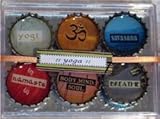 These are definitely the coolest magnets we've ever seen. They are handmade by a Portland-based artist who has a fabulous eye for design. Recycling and reusing are an integral part of her process, so each of her unique magnets incorporates a found bottlecap (as opposed to a brand new one that she could have ordered). These beautiful magnets are the perfect example of a useful object becoming art. The magnets included in the six-piece set are: yogi, om symbol, savasana, namaste, 'body, mind, soul', and breathe. The packaged set measures 3 1/2" x 2 1/2" x 1/2". This item makes an excellent gift!Yoga-Themed Magnet Set